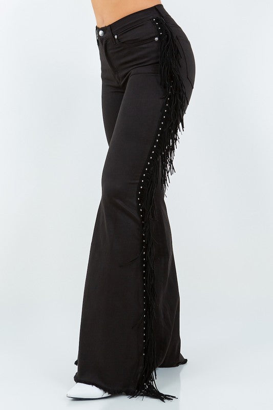 Get ready to make a statement with our Texas Sun Fringe Bell Bottom Jean! These high-rise bell bottom jeans boast both style and functionality with front and back pockets, a button and zipper closure, and a frayed hem. Complete with a unique side tassel fringe detail, these jeans are proudly made in the USA. Yee-haw!