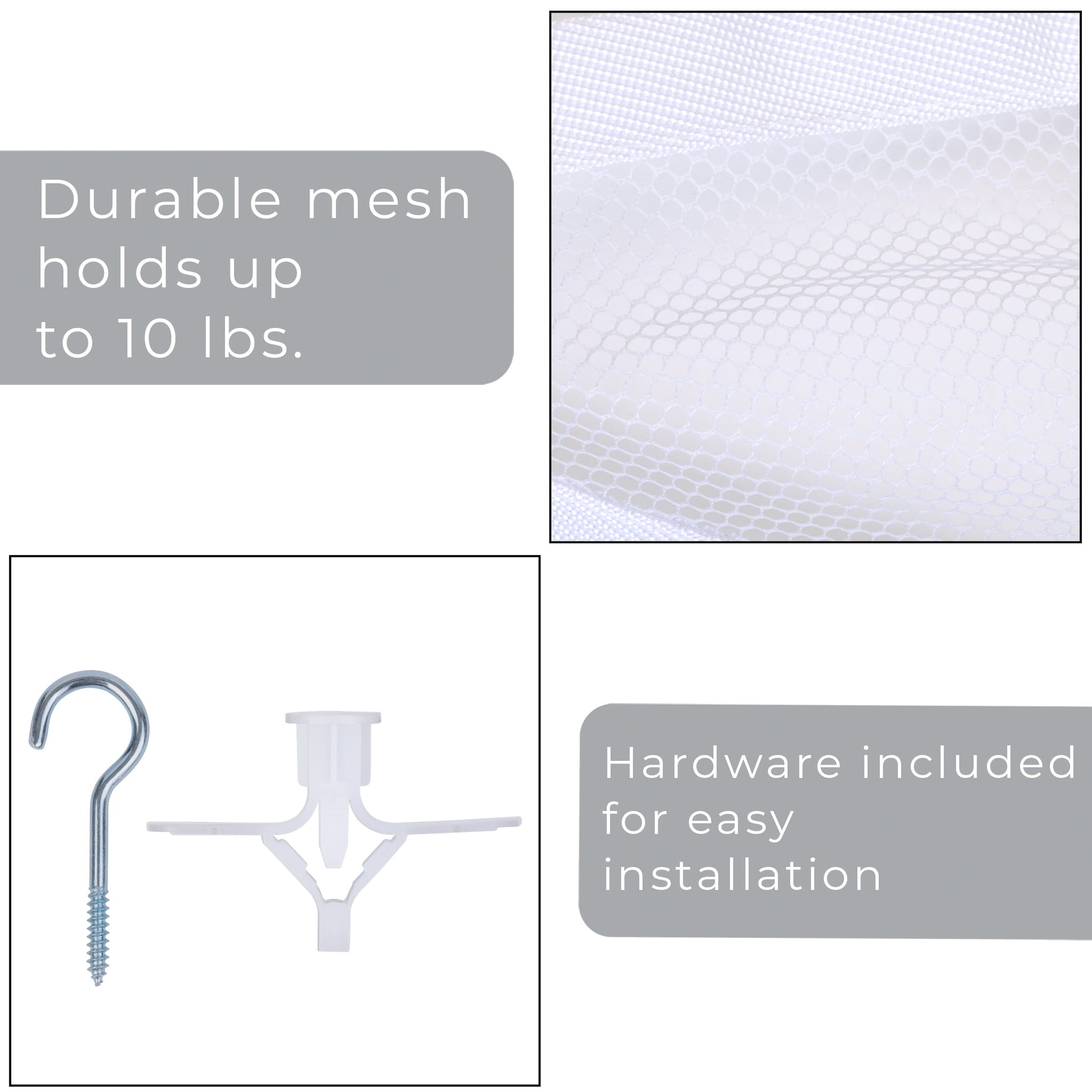 Mainstays Hanging Storage Net in white mesh is the ideal storage solution for plush toys and more! Great to store anything you want to get off the floor! Perfect for getting stuffed animals and other toys in the children's room off the floor. Also use in the garage or storage unit to get sporting equipment off the ground. The net is easy to hang and holds up to 10lbs. Hanging hardware is included. The Your Zone Hanging Storage Net in white mesh is the perfect storage solution for your home.