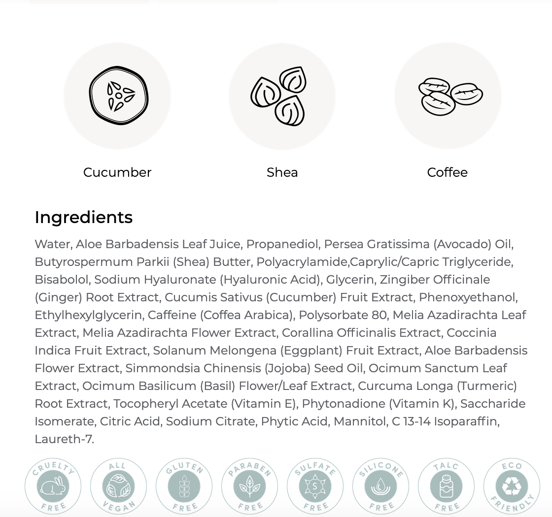 Natural sugars and vitamins E and K will continue to hydrate and smooth the appearance of the delicate skin around the eyes! Complex of all-star botanical extracts: Aloe, Shea, Avocado, Cucumber, Coffee, Eggplant, Jojoba, Holy Basil, Turmeric, Ginger. And it smells heavenly!