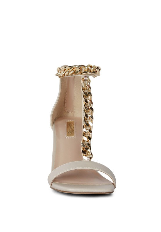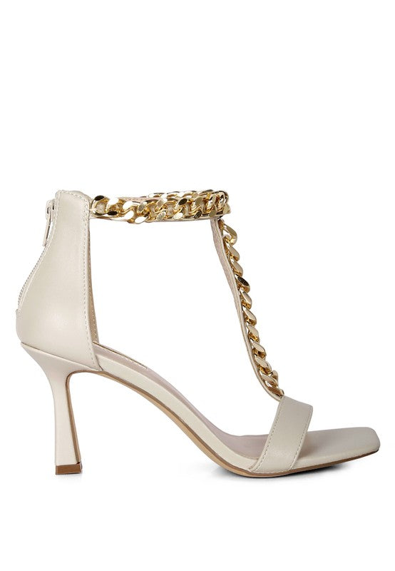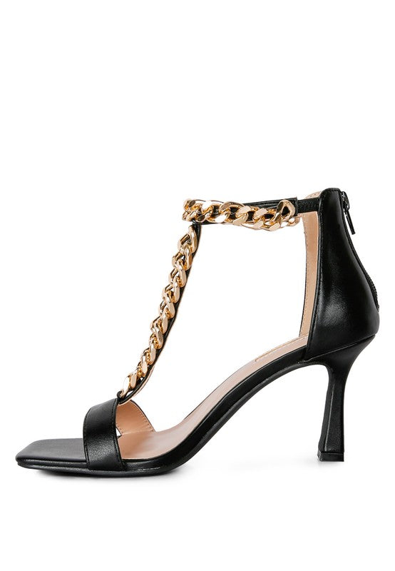金属链条装饰和T字带细节,中跟凉鞋时尚又吸睛!这款细高跟凉鞋的后部有拉链开口,正面看起来干净利落,鞋跟高度舒适,适合外出游玩。